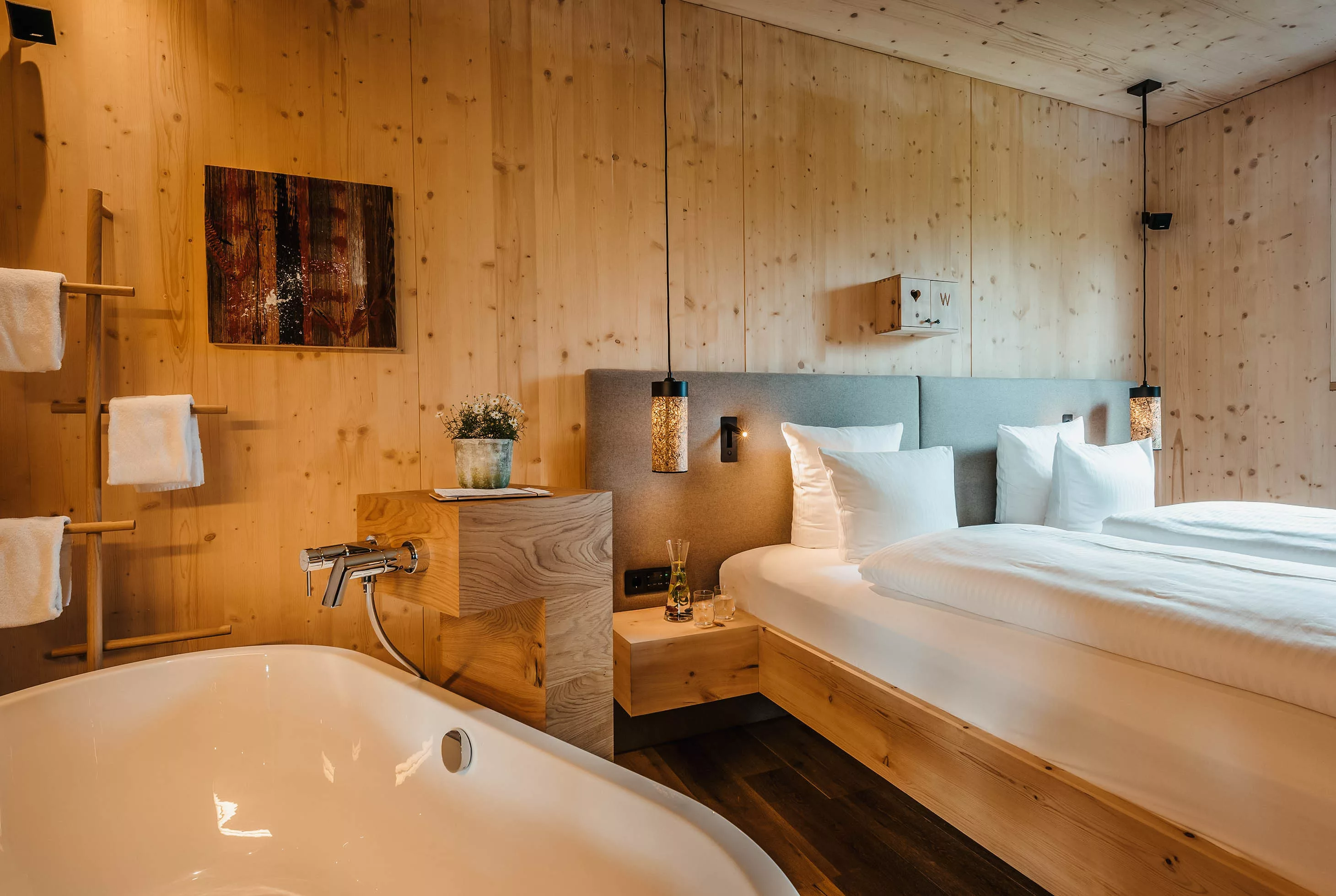 Groß, luftig und hoch oben unterm Dach. Hier findet man puren Luxus über zwei Etagen. Dazu gibt es jede Menge Weitblick. Die Highlights sind in dieser Suite: der offene Sichtdachstuhl und die private Sauna. Eine wunderschöne, offene und lichtdurchflutete Suite.