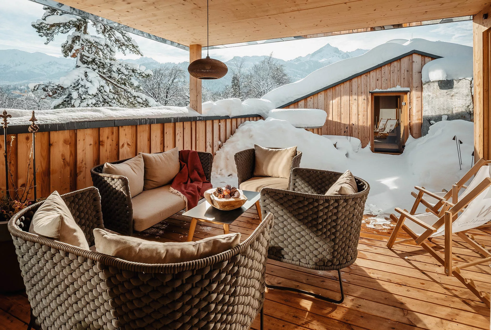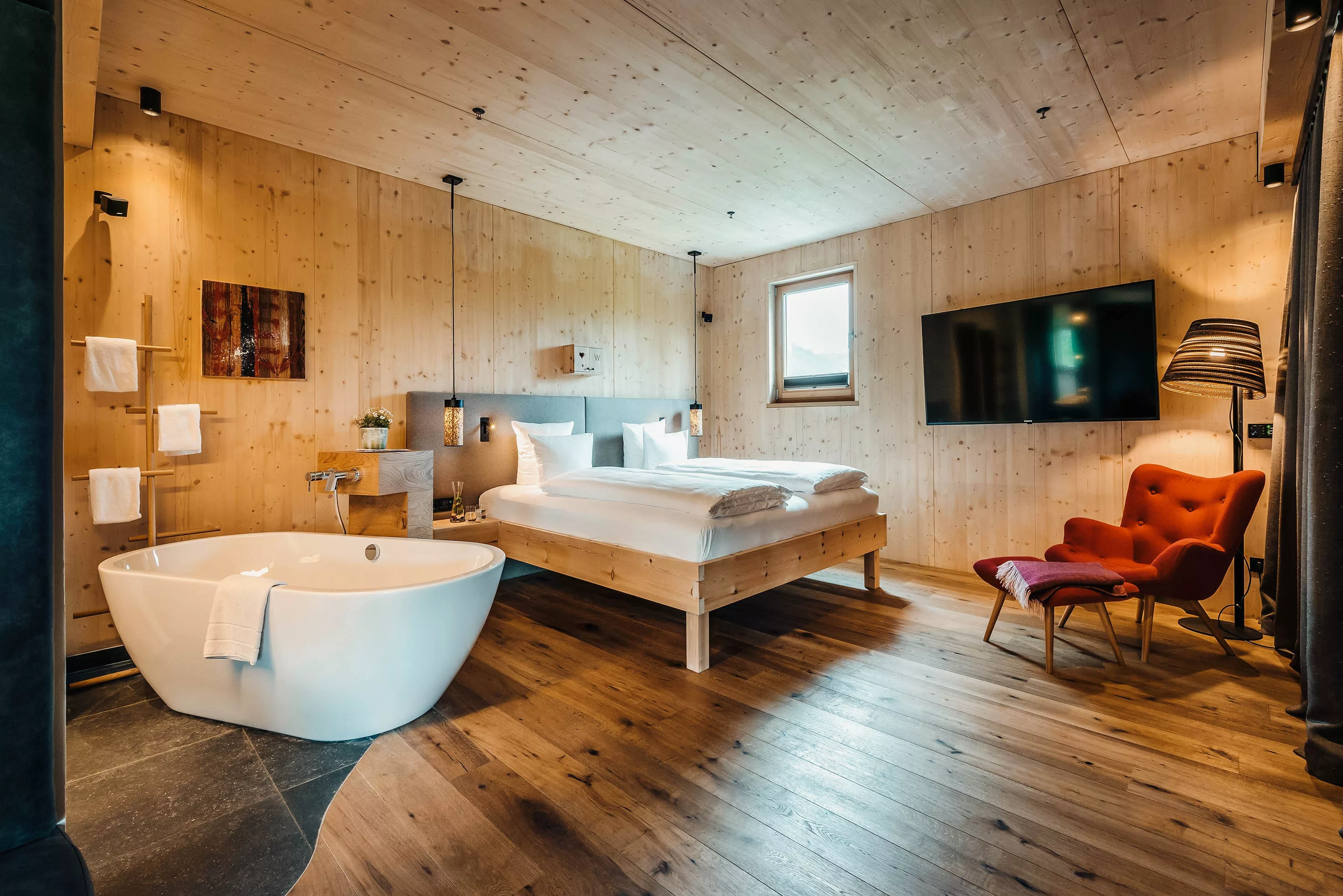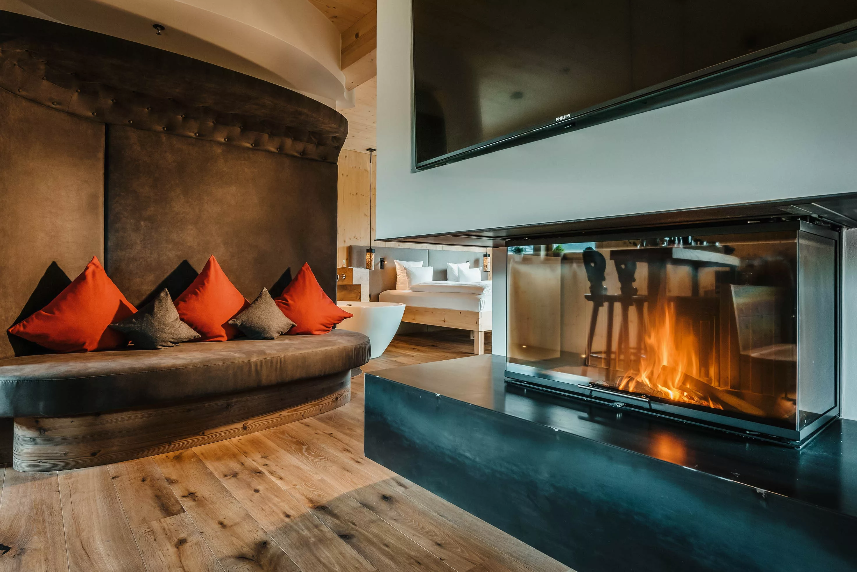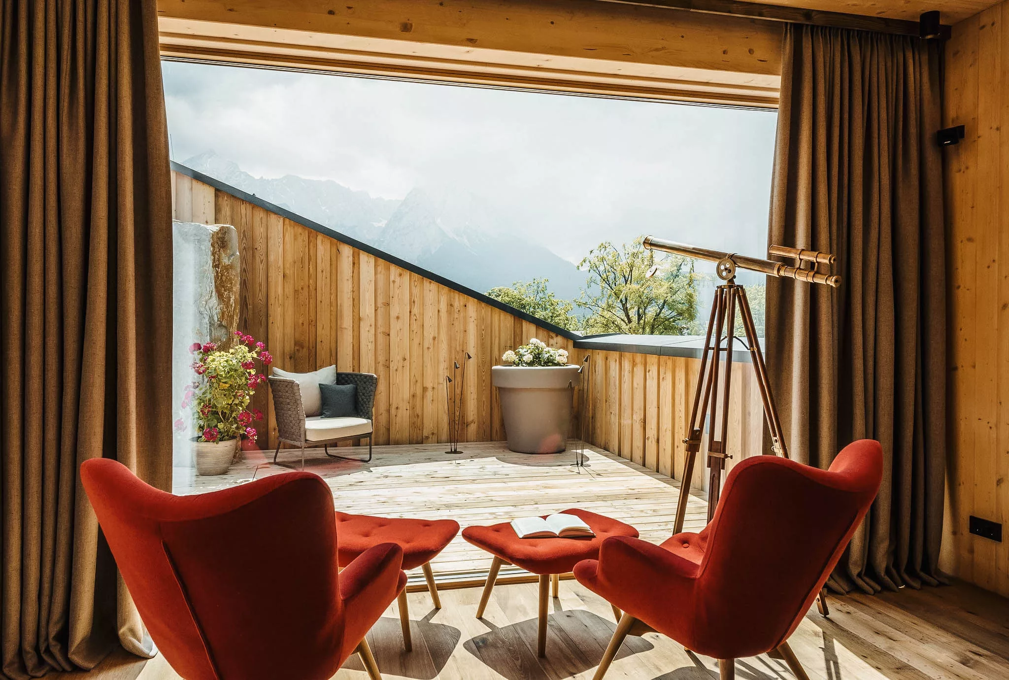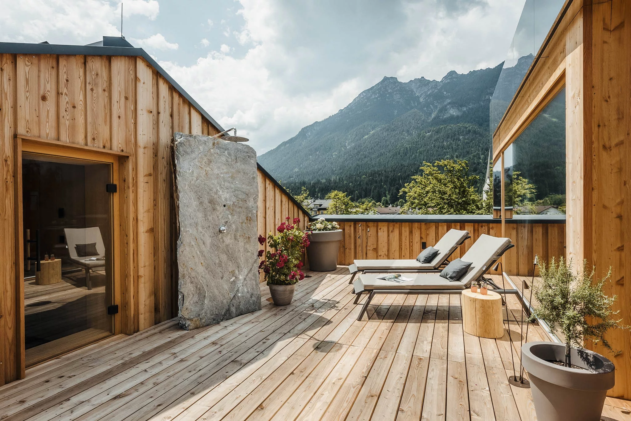 At the very top, on the 4th floor, you’ll find our Top Suite. Featuring a spacious rooftop terrace, a private sauna and a hot tub, this suite is truly something special. The king-size bed offers a breathtaking view through the large panoramic windows towards the “mountain of mountains”. Waking up with a panoramic view included. The 60 m² rooftop terrace brings nature right to your doorstep, while the cosy living area with corner bench seating, daybed, fireplace and two comfortable designer armchairs invites you to linger and unwind. Using the antique telescope, you can observe the surrounding nature and feel incredibly close to the dramatic peaks of the Jubiläumsgrat, which stretches from the Zugspitze to the Alpspitze. After a day full of unforgettable experiences, relax in your private sauna and hot tub before ending the evening either in the covered, heated outdoor lounge area or by the fireplace in the living room.