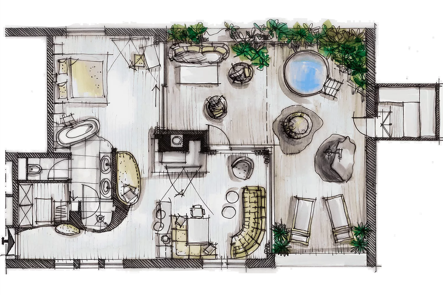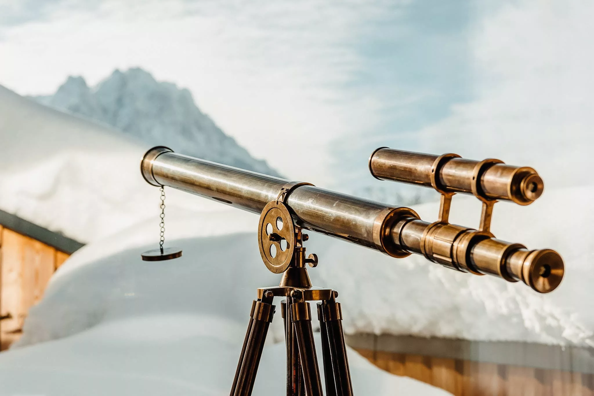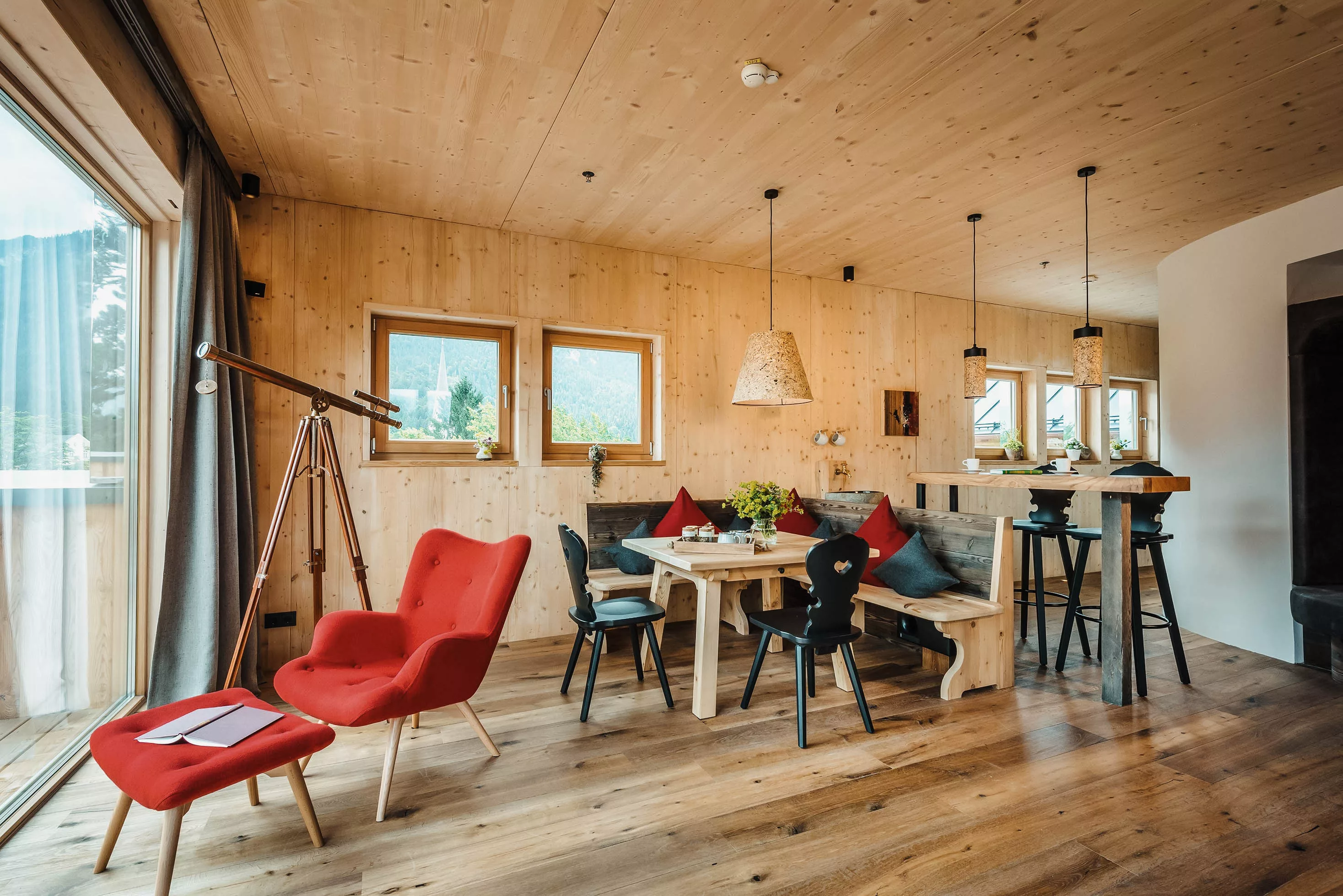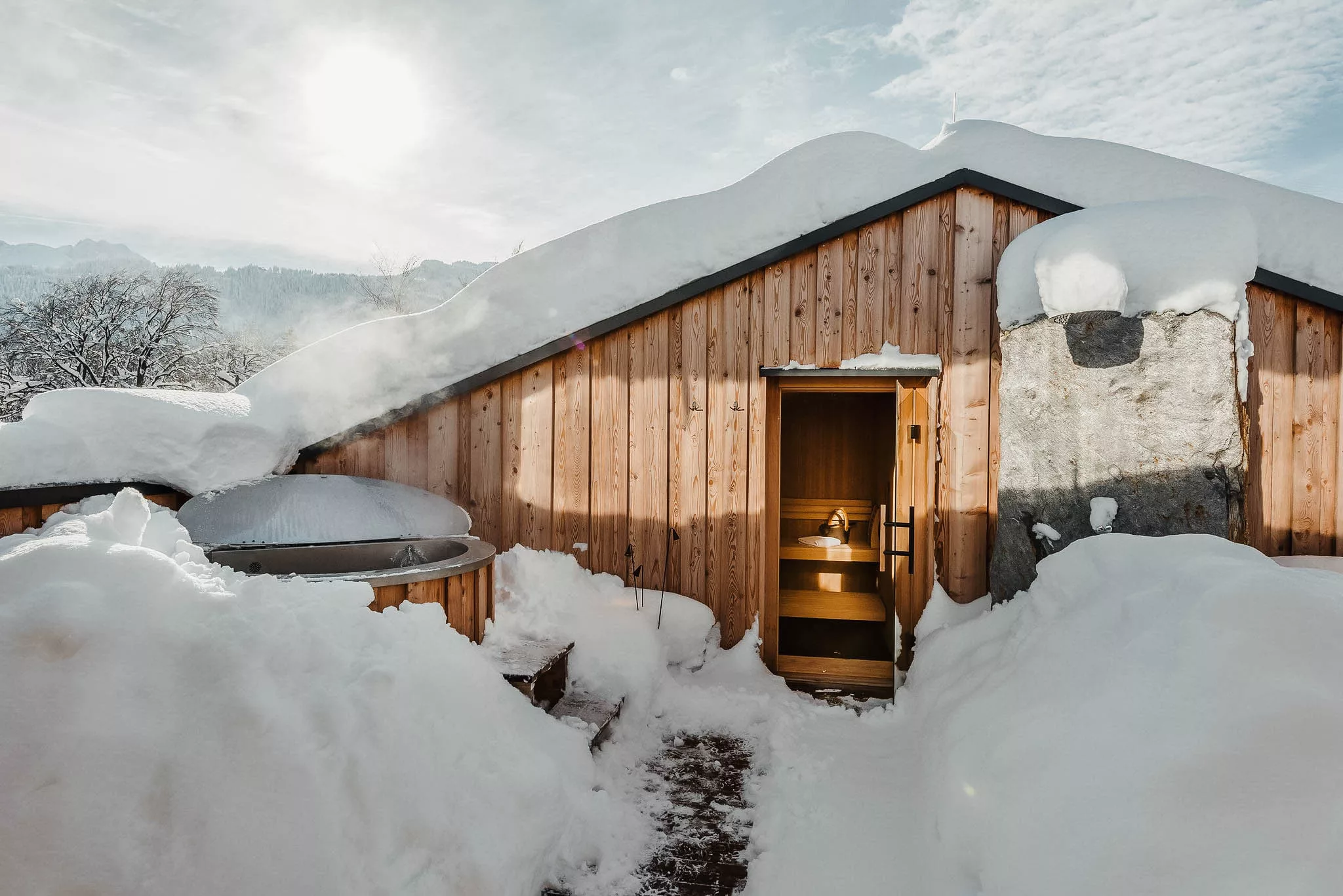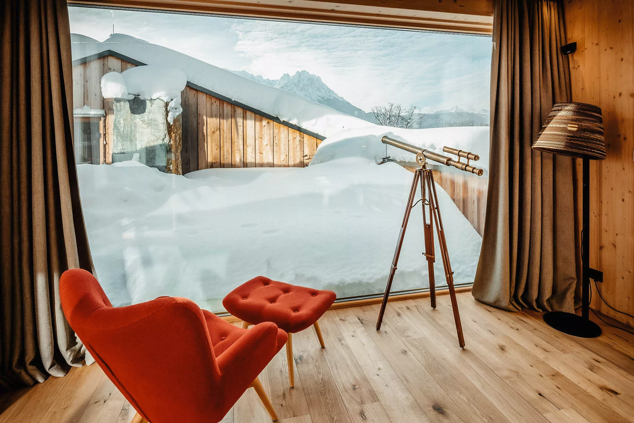 At the very top, on the 4th floor, you’ll find our Top Suite. Featuring a spacious rooftop terrace, a private sauna and a hot tub, this suite is truly something special. The king-size bed offers a breathtaking view through the large panoramic windows towards the “mountain of mountains”. Waking up with a panoramic view included. The 60 m² rooftop terrace brings nature right to your doorstep, while the cosy living area with corner bench seating, daybed, fireplace and two comfortable designer armchairs invites you to linger and unwind. Using the antique telescope, you can observe the surrounding nature and feel incredibly close to the dramatic peaks of the Jubiläumsgrat, which stretches from the Zugspitze to the Alpspitze. After a day full of unforgettable experiences, relax in your private sauna and hot tub before ending the evening either in the covered, heated outdoor lounge area or by the fireplace in the living room.